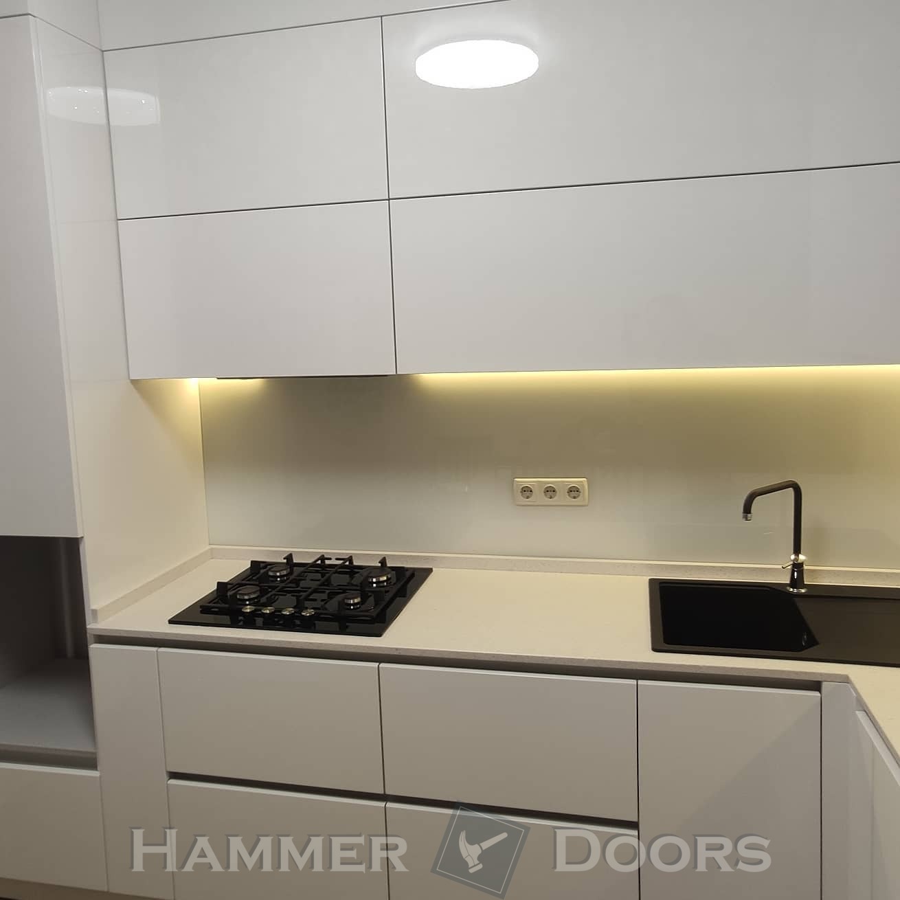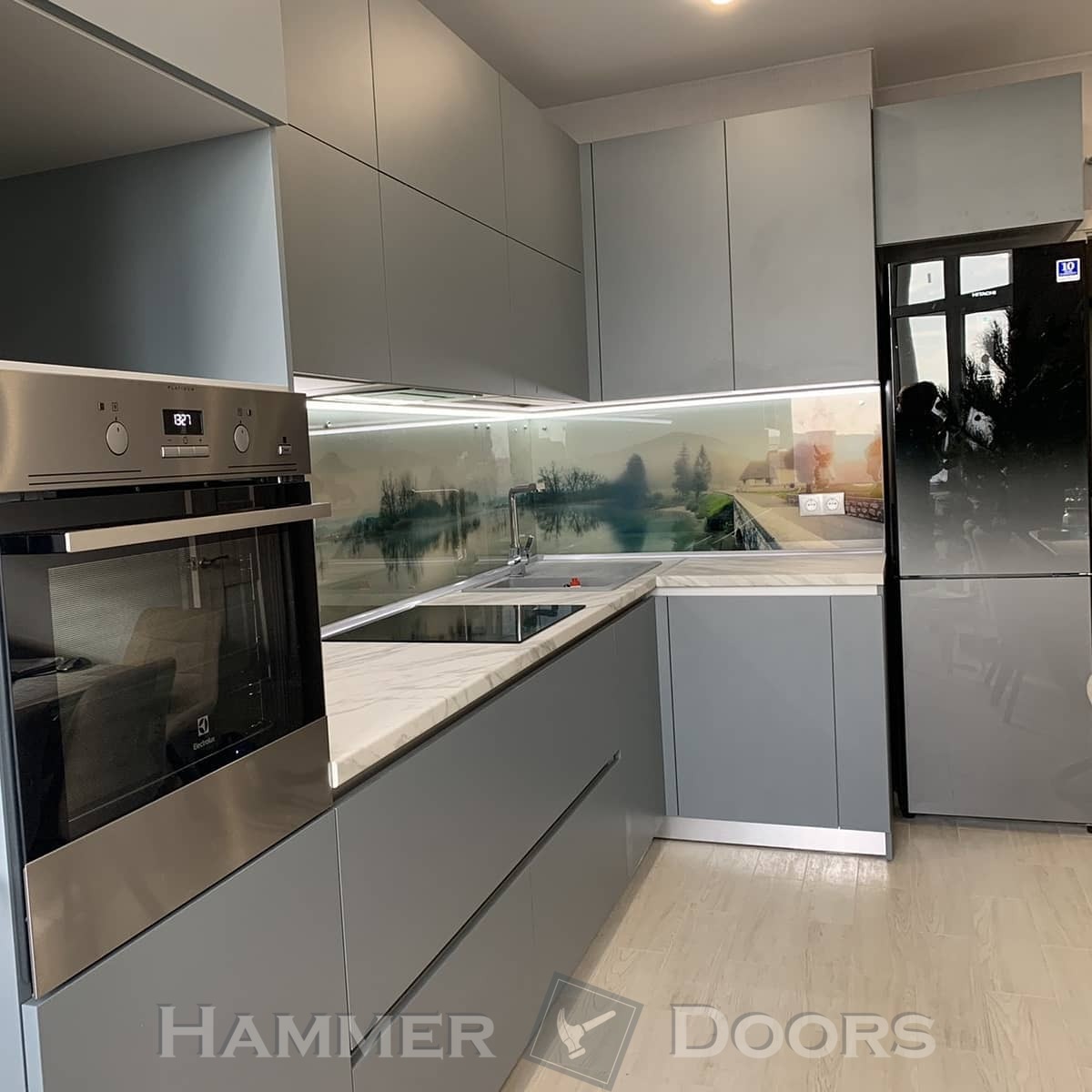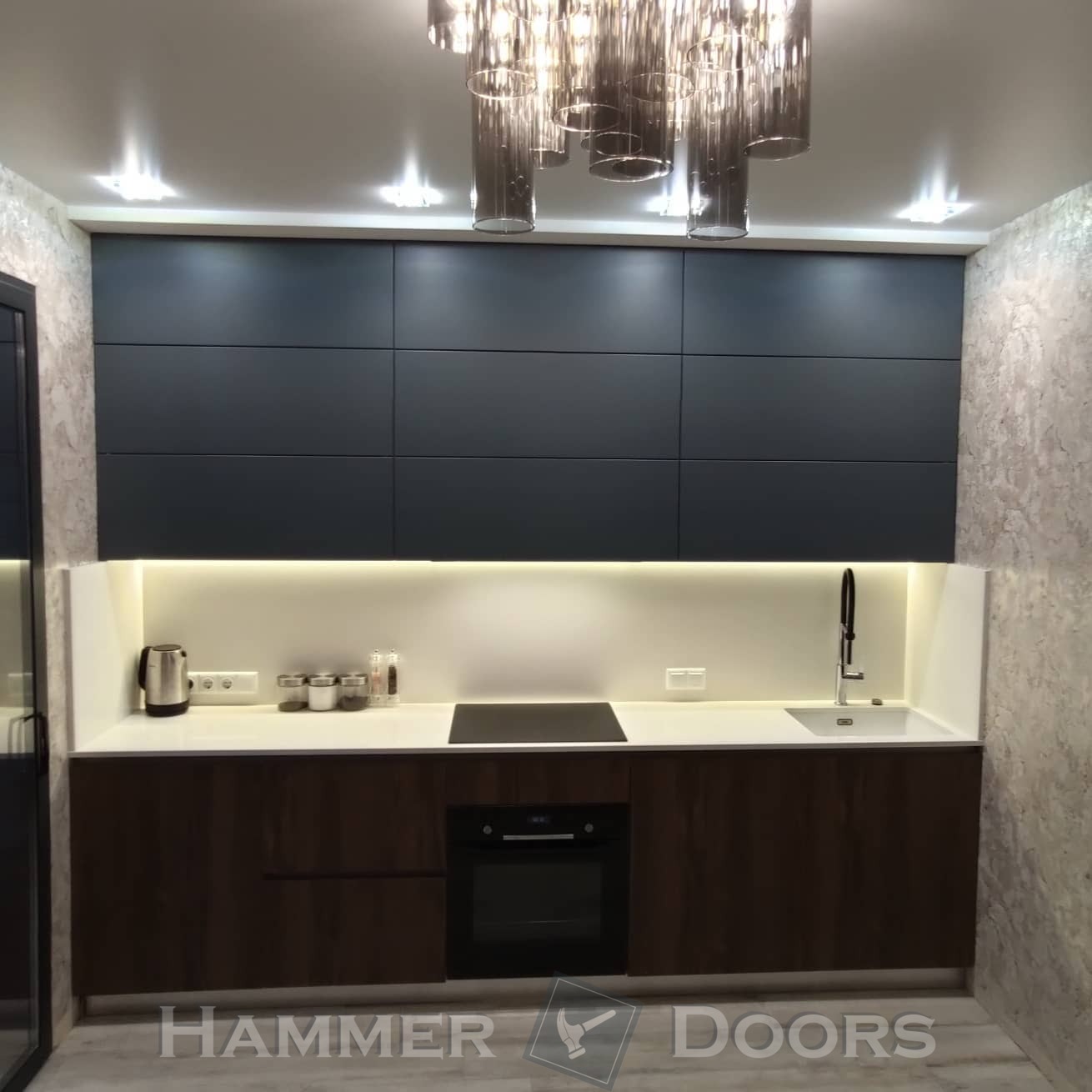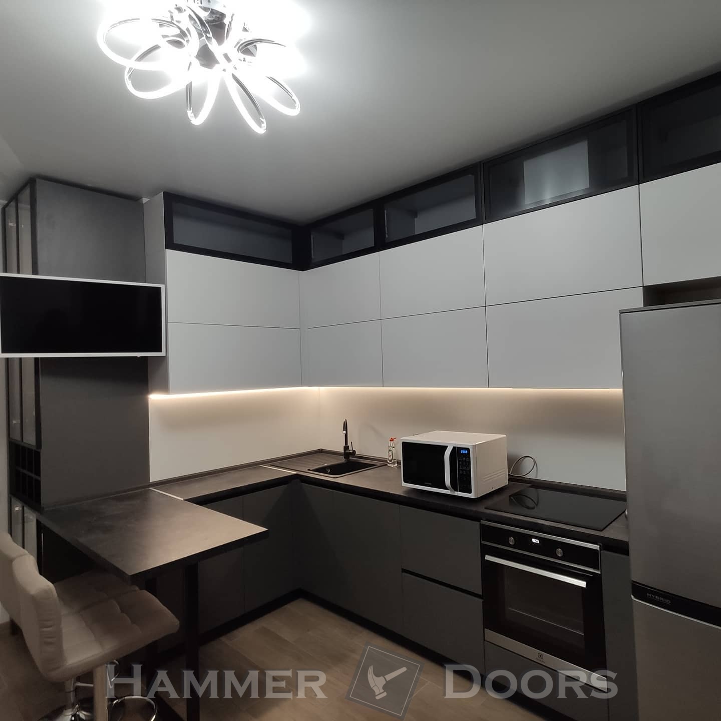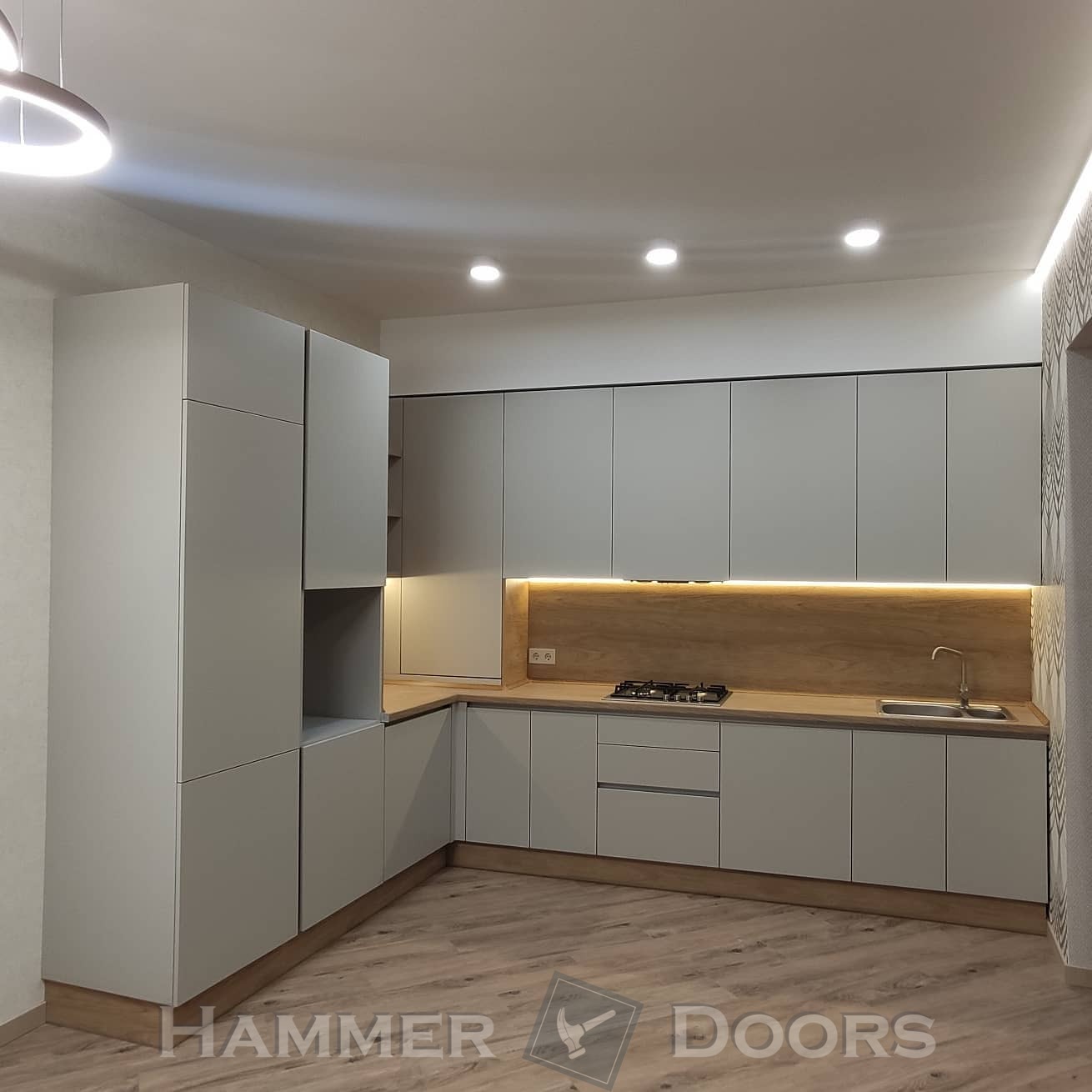 Кухня с крашенными фасадами и пеналом с подсветкой