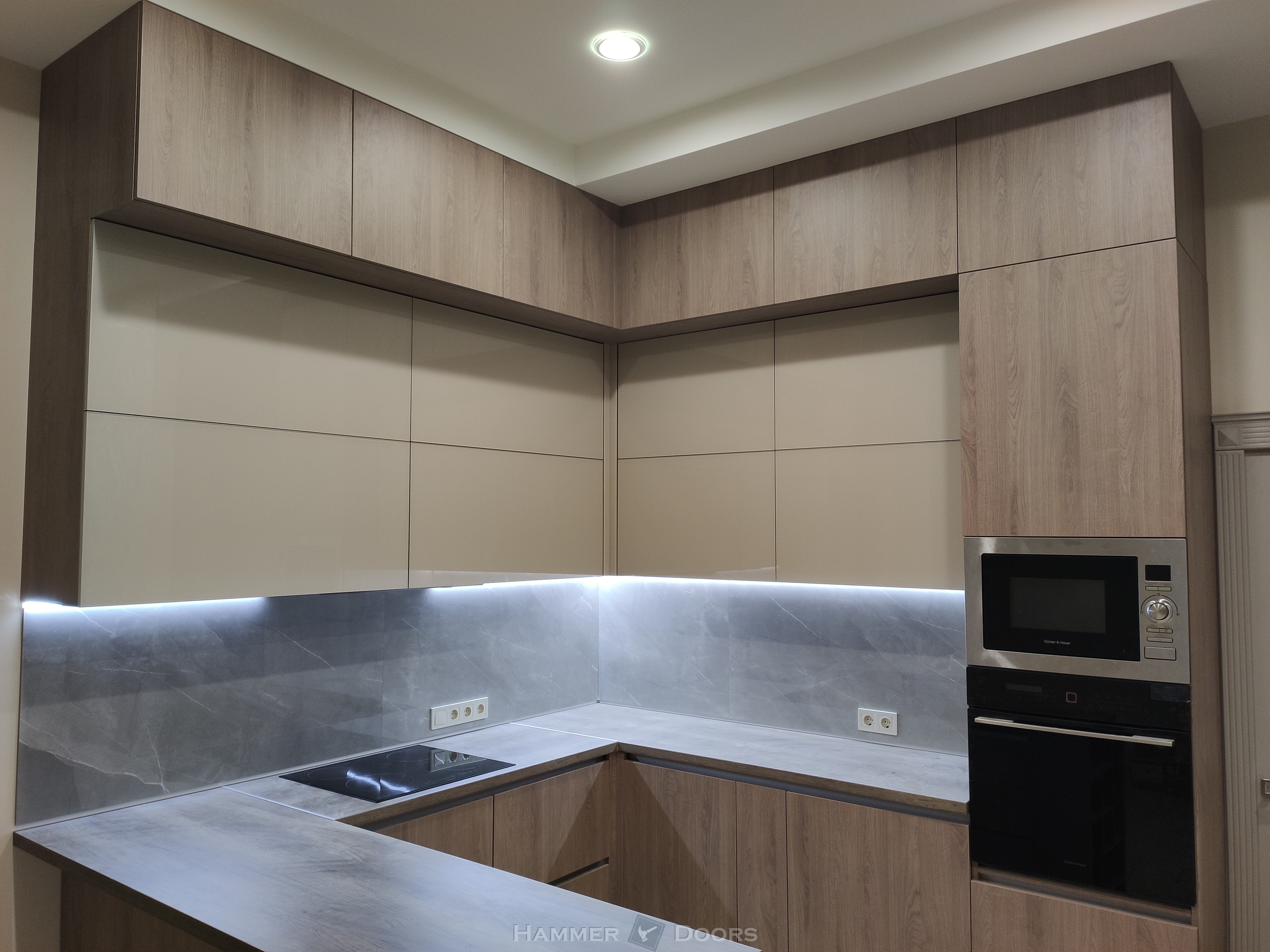 Сочетание ЛДСП Egger древесной текстуры (Дуб Корбридж серый) и стеклянных фасадов из лакобель (1015, бежевый) , алюминиевый профиль фирмы ZOBAL |