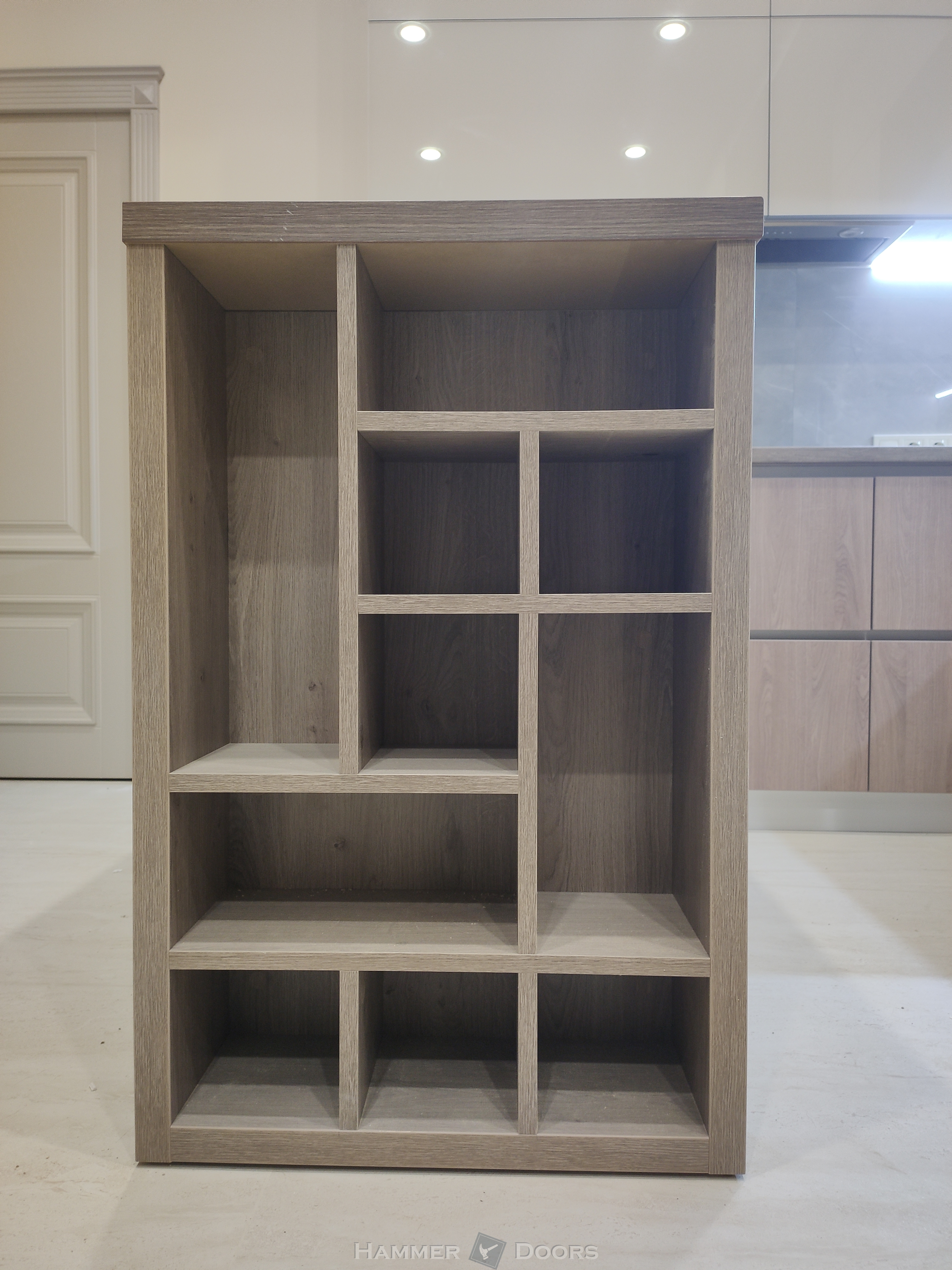 Текстура дерева нижнего яруса, пенала и антресолей прекрасно сочетается со стеклом лакобель бежевого цвета и придает нотки тепла и уюта помещению.