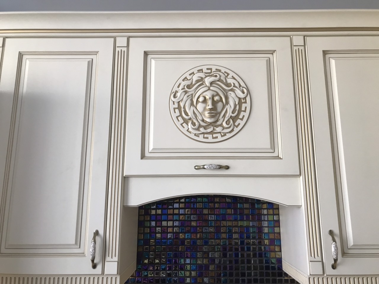 Классическая белая кухня выглядит всегда изысканно и благородно. Светлые тона создают объем и визуальное ощущение свободного пространства даже в небольших помещениях. Изюминкой данного гарнитура является элегантная золотистая отделка фасада, наличие пилястр украшенных резными узорами, а так же радиусные фасады, оригинальные дверцы верхнего ряда и конечно же столешница из кварца.