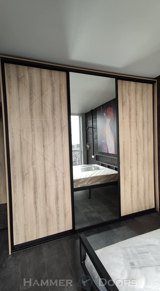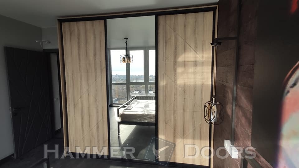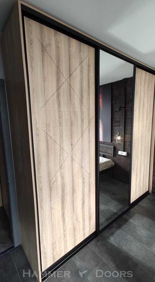 Вместительный шкаф-купе с фасадами из МДФ в ПВХ покрытии и зеркалом.