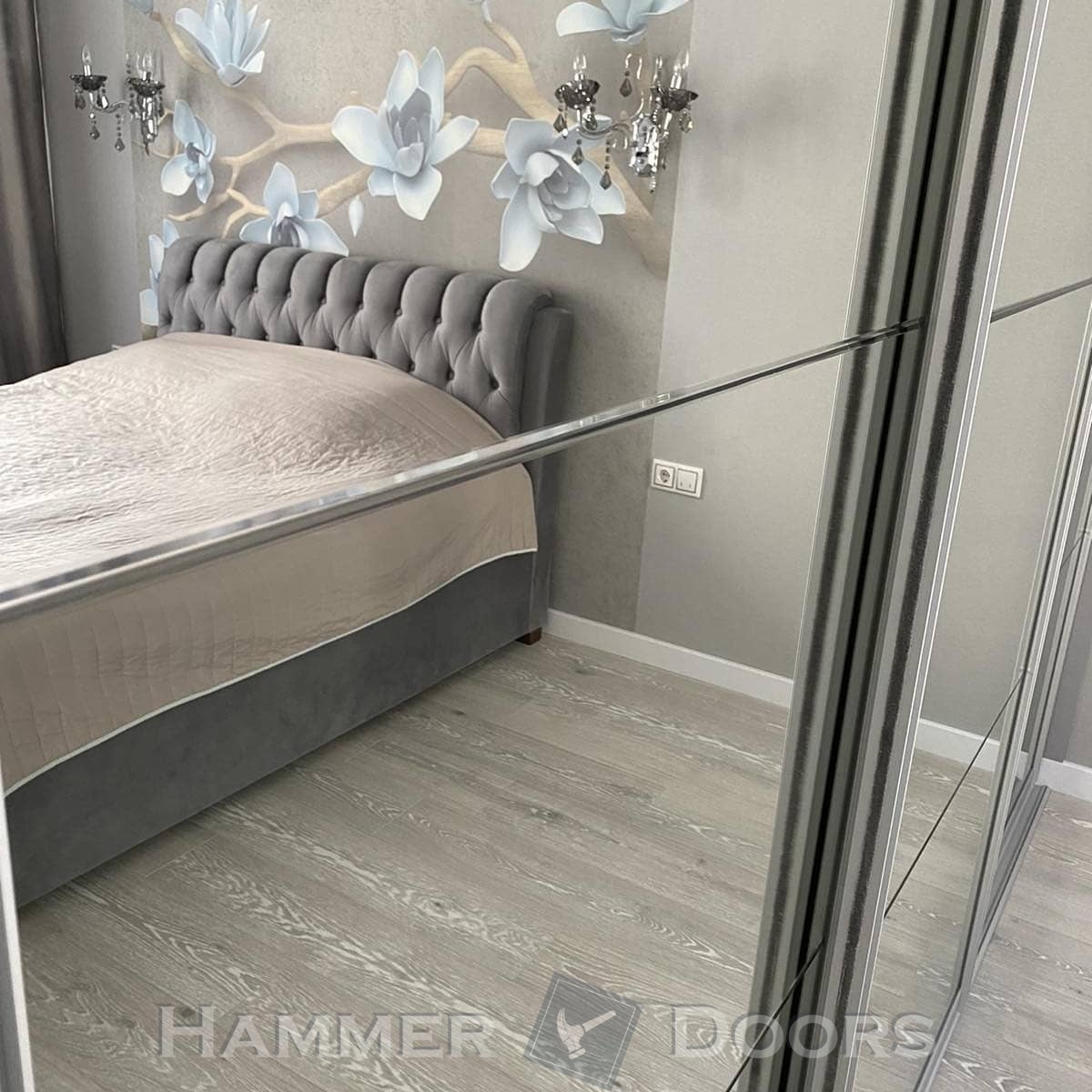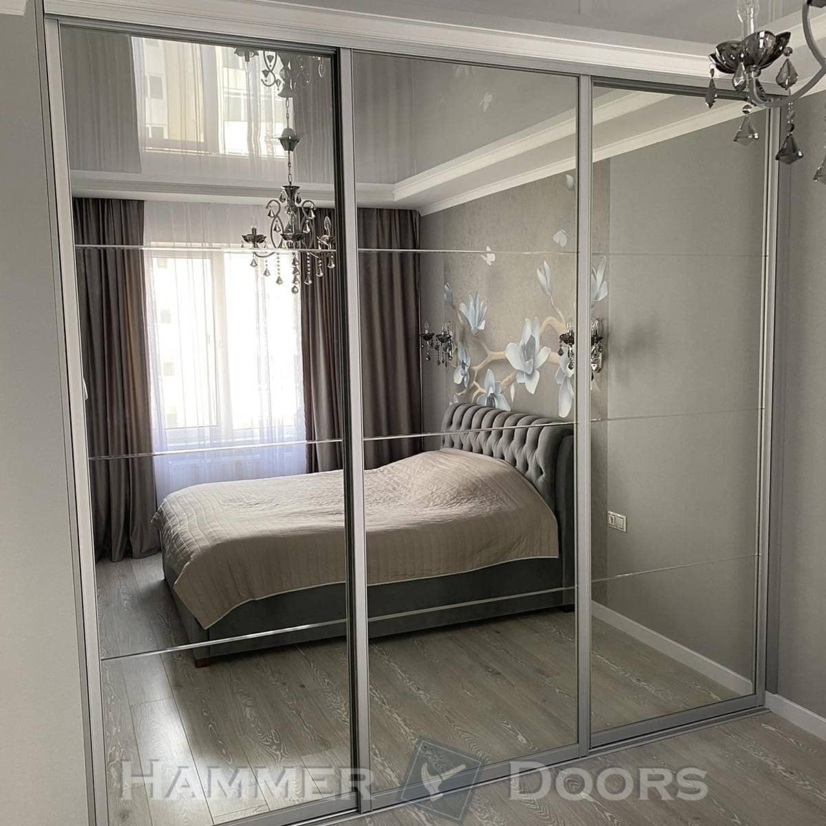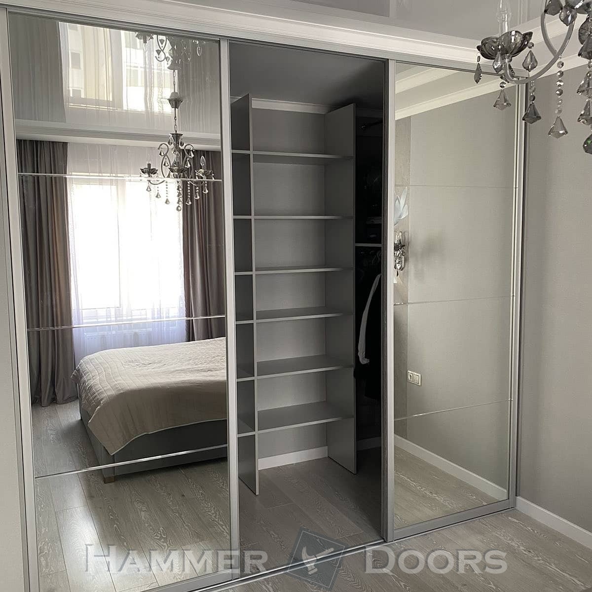 Данный встроенный гардероб представлен с раздвижной системой из трех фасадов. Наполнение раздвижных дверей — зеркало с алмазной гравировкой. Для системы использован Н-образный профиль ADS.