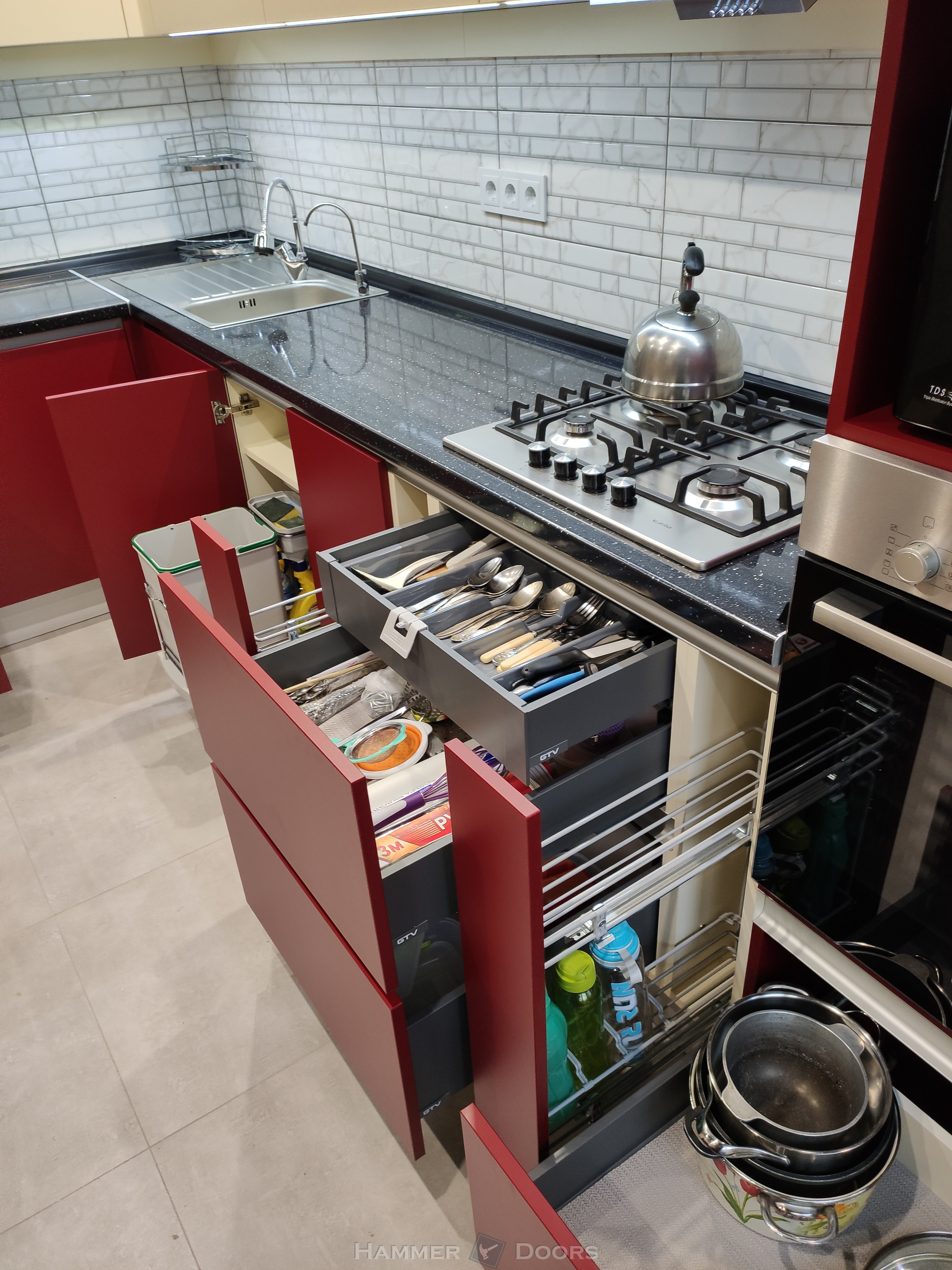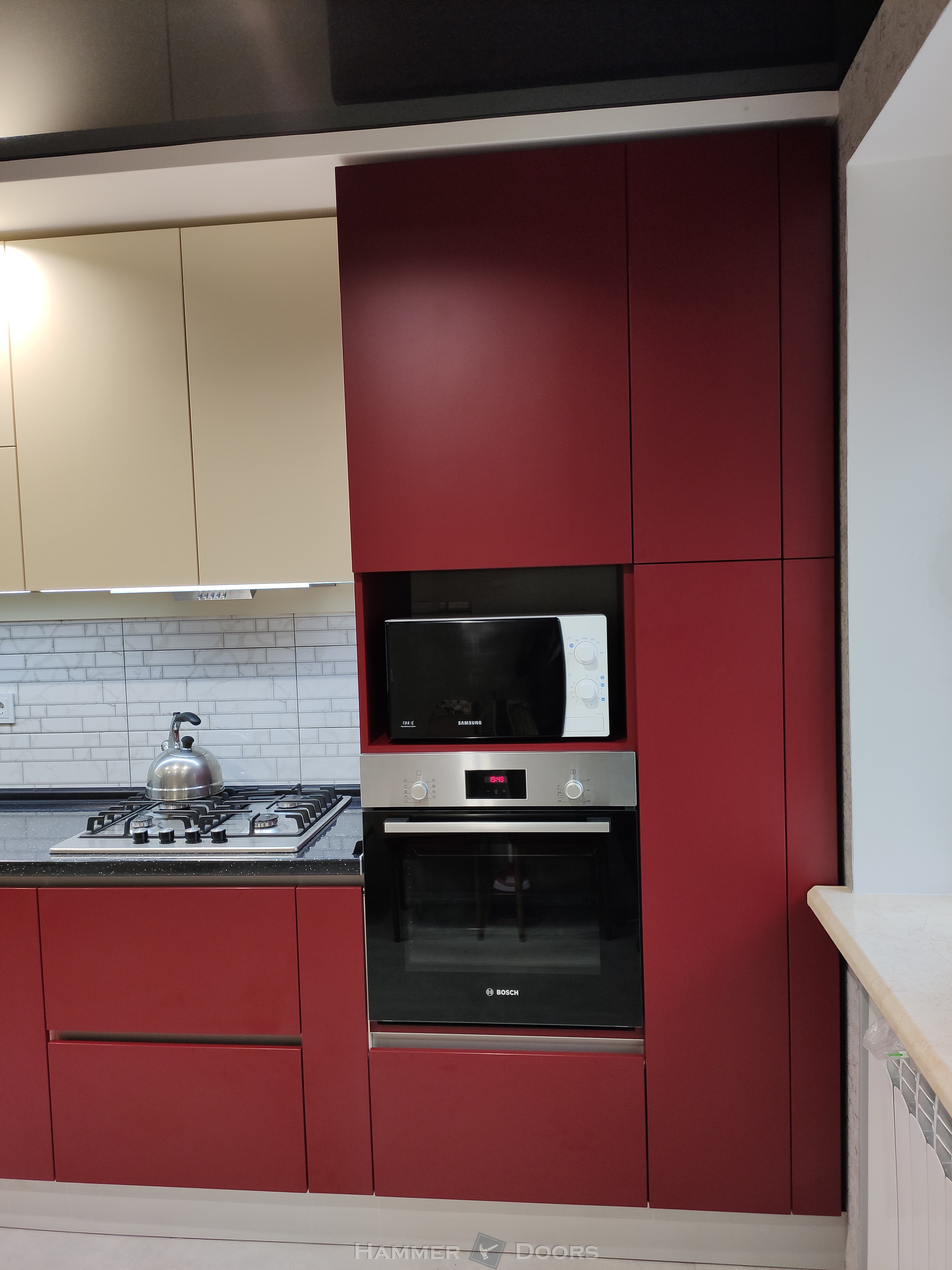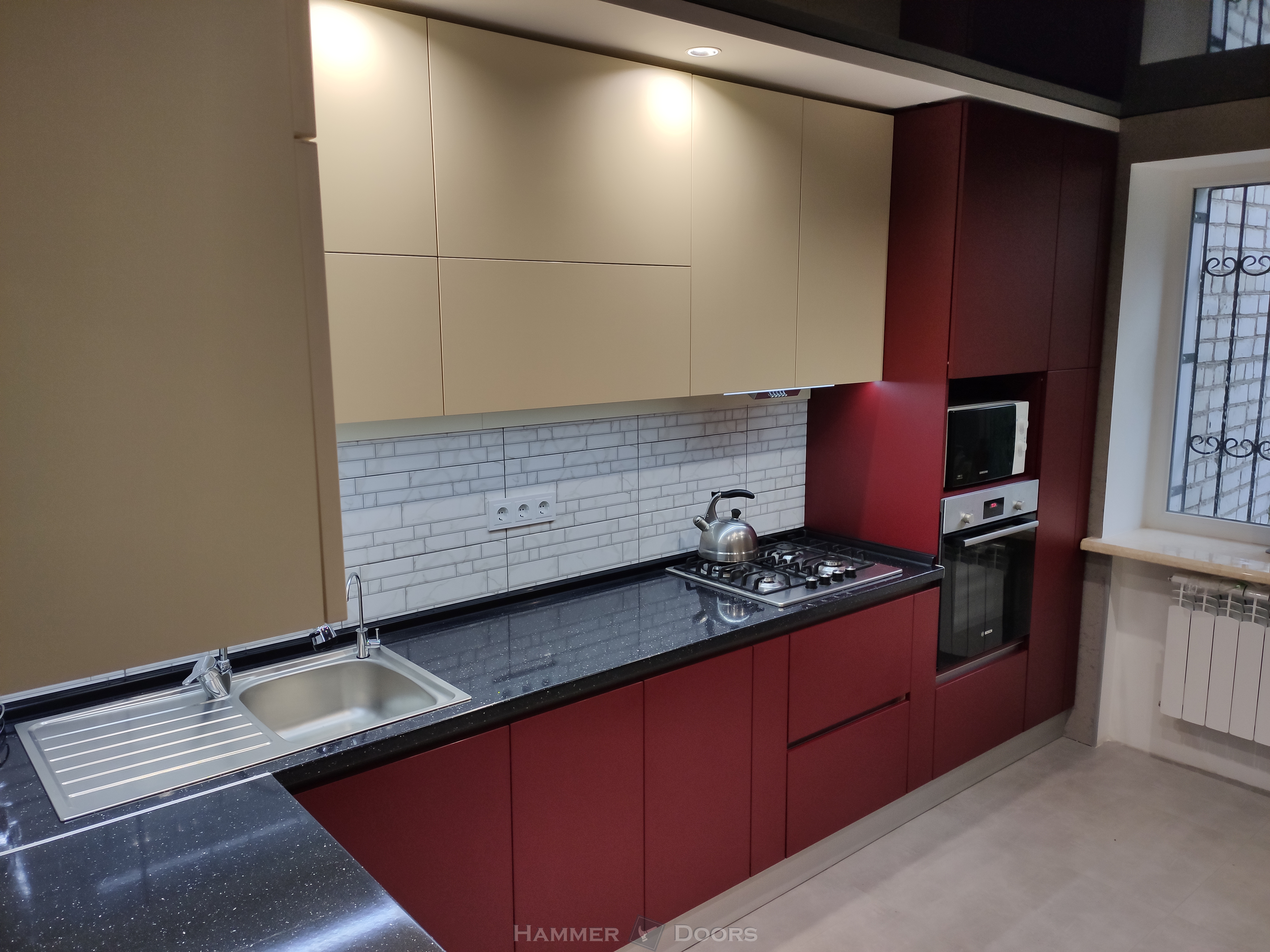 В данном гарнитуре использовано сочетание двух цветов. Красный низ прекрасно сочетается с кремовым, бежевым верхом.